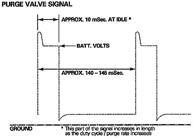 The ECM drives the purge valve by grounding the purge valve solenoid coil. The drive signal (pulse width modulated) is a square wave that is mapped in the ECM to provide optimum purge rates. When purge is enabled, the frequency of the drive signal is constant, but the dwell ("valve open" time) changes with engine load and speed. If the oxygen sensor detects excess air in the exhaust, the ECM closes the purge valve for up to 20 minutes. allowing the canister to collect more vapor.