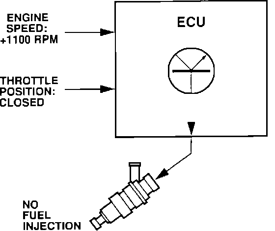 The PCME initiates fuel cut-off (cancels injector operation) when throttle is closed, engine speed is above 1100 rpm, coolant temperature is above 86°F (25°C) and 1500 rpm has been exceeded since engine start.