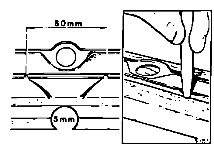 ^ From the gasket center, measure 50 mm in each direction along the bottom edge of the gasket. Using a 5 mm hole punch, cut out holes at the 2 x 50 mm measured positions on the gasket, (Fig. 2).