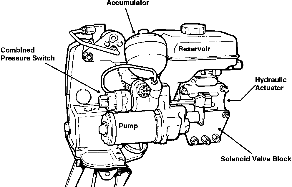 The anti-lock unit integrates the motor, pump, reservoir, and the hydraulic actuation unit on the brake pedal and accelerator housing. A steel pipe connects the motor-pump unit to the hydraulic actuation unit.