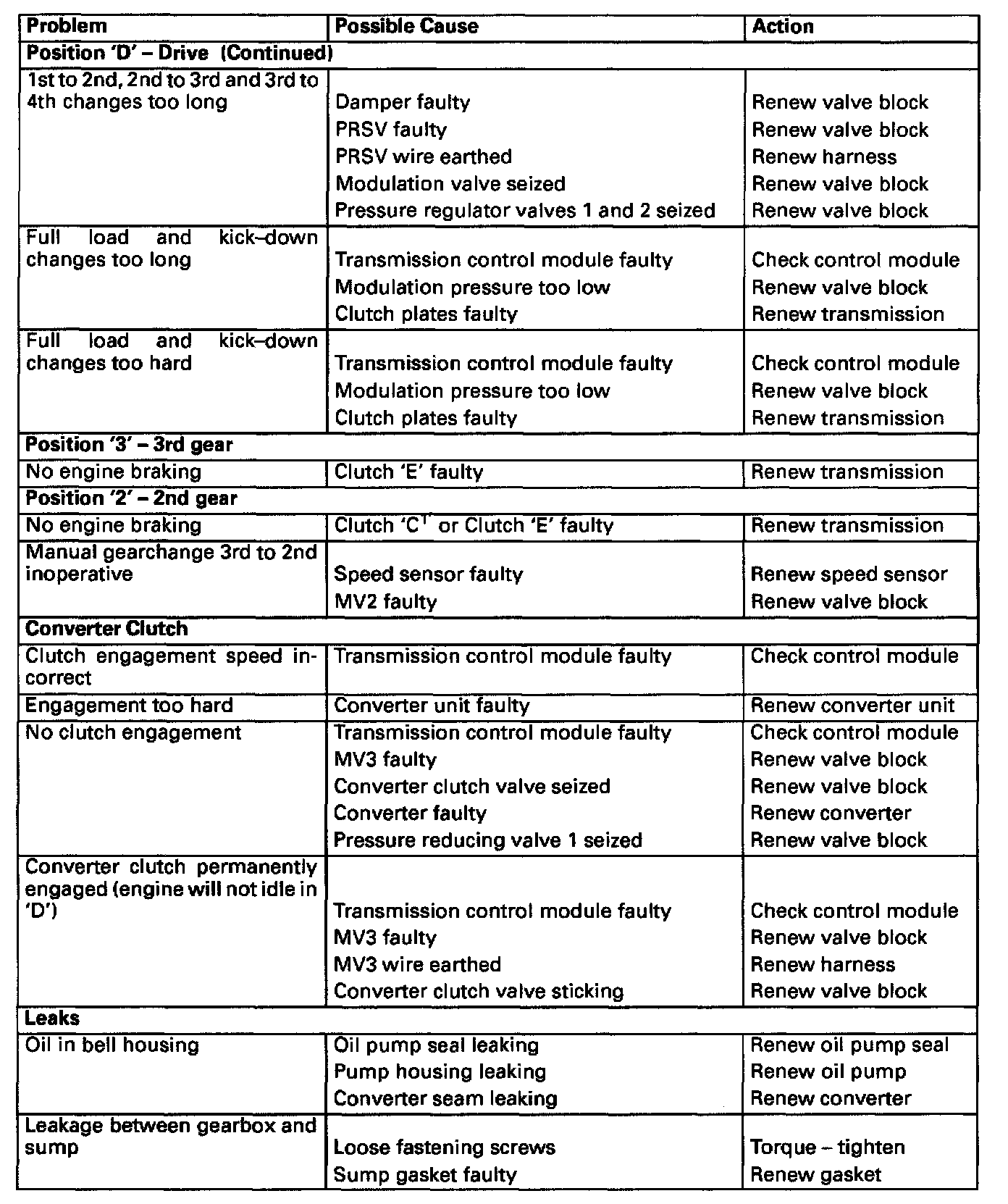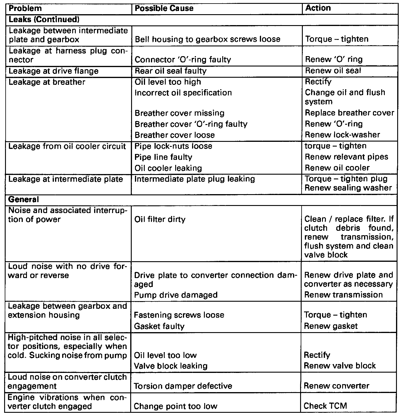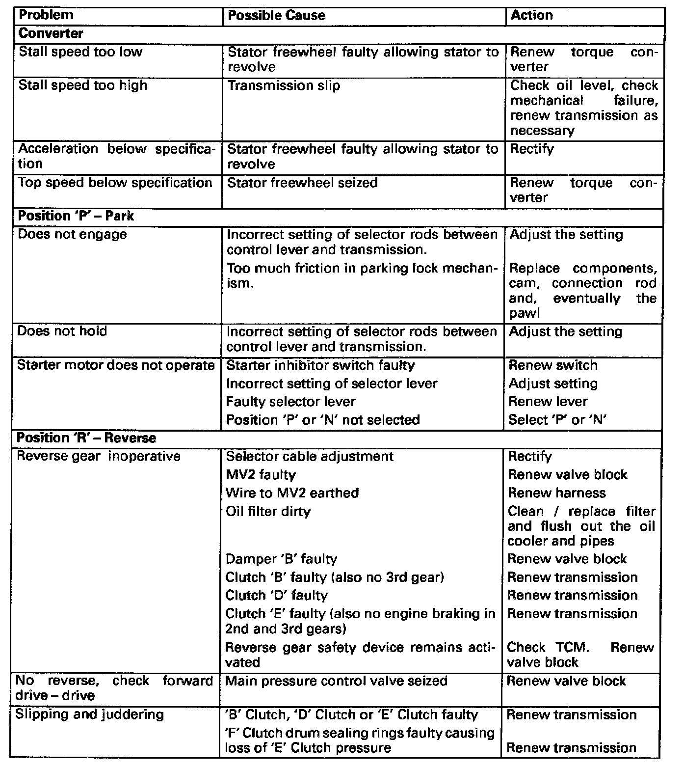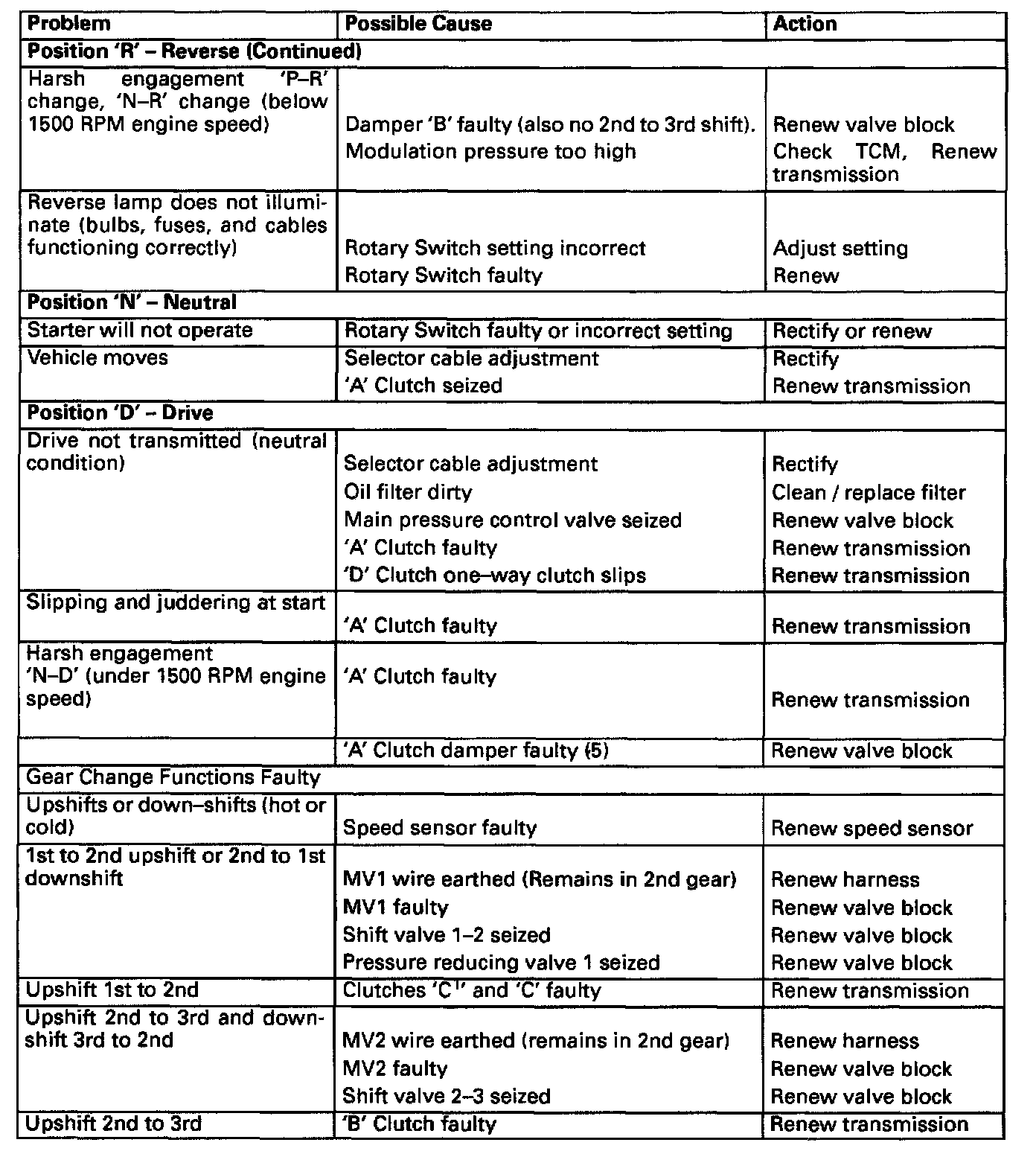 FAULT DIAGNOSISThe following tables are intended as a guide to diagnosis of possible faults in the transmission unit. Where the fault concerns a leak it is recommended that it is located by the use of a crack detection fluid such as for example Met-L-Chek. This product is available on the market in spray form and permits the leakto be located after a short test drive.