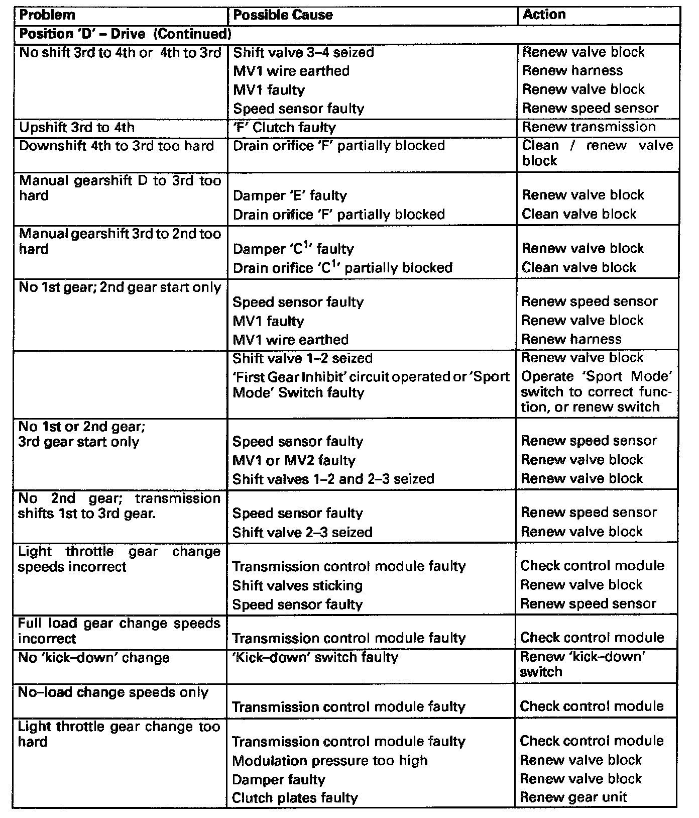 Fully check all shift speeds and note. Compare the results with the specification in addition to general observations of transmission behaviour, noises, leaks etc., and consult the following Fault Finding Chart.