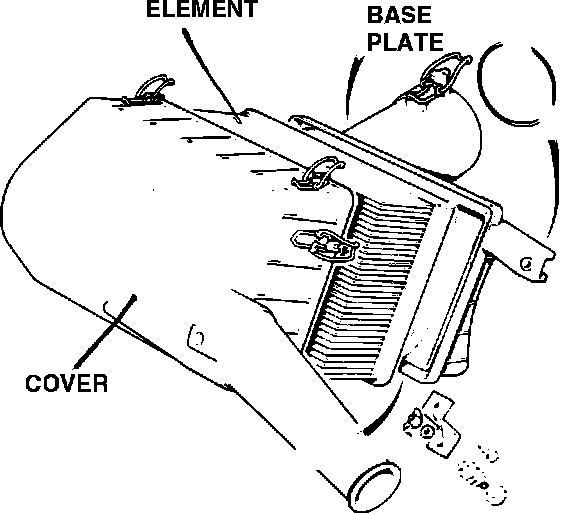 Air filter assembly consists of a cover housing, air filter element and base plate. Cover housing holds air filter element in place and has air inlet snorkel attached.