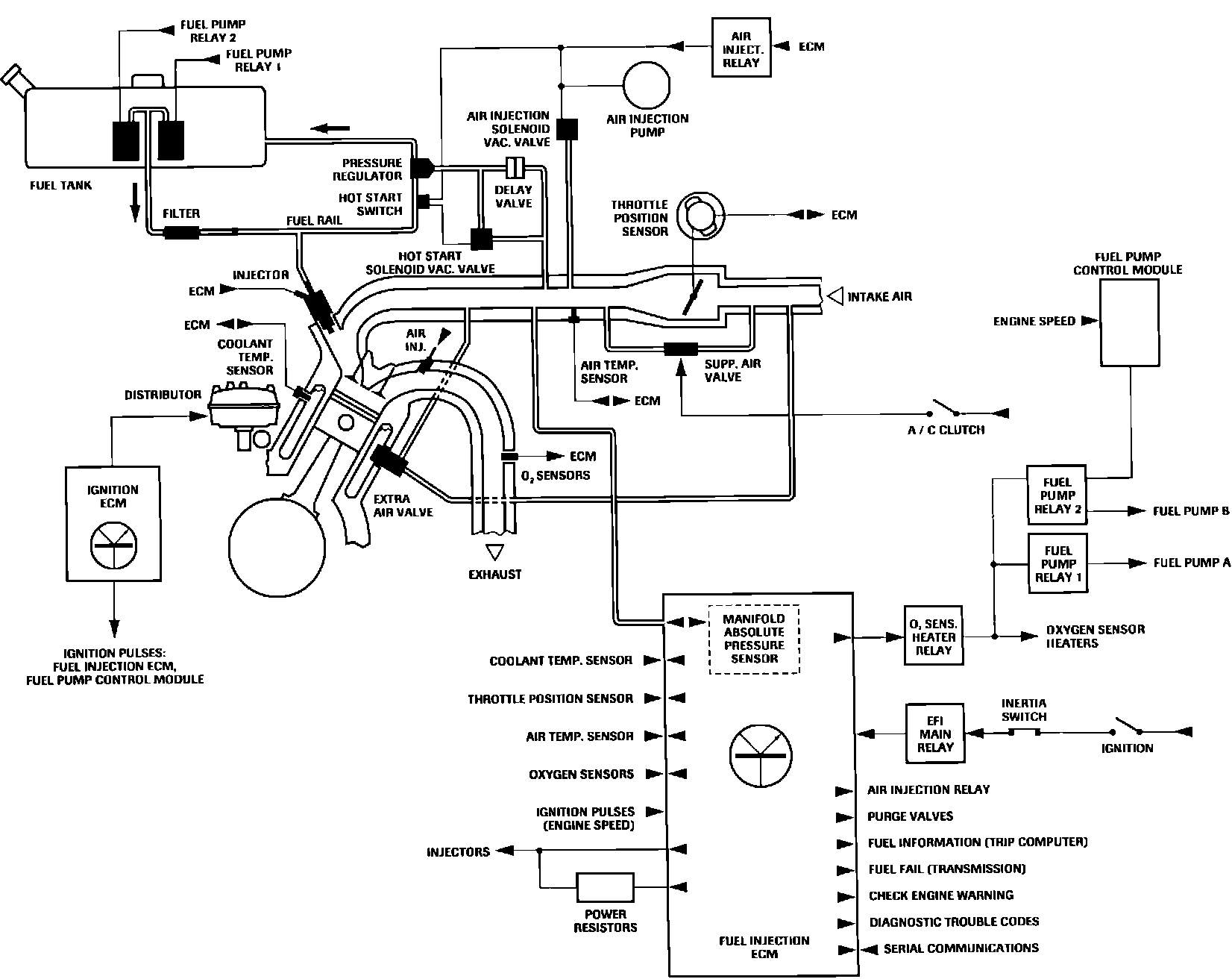 Various engine sensors and other systems supply ECM with operating information. ECM processes sensor inputs and sends output signals in order to maintain optimum air/fuel ratio. ECM also monitors exhaust gas oxygen content by way of input from a pair of oxygen sensors. When adjustments are needed, ECM varies injector pulse width ("ON" time) as the means of controlling air/fuel ratio.