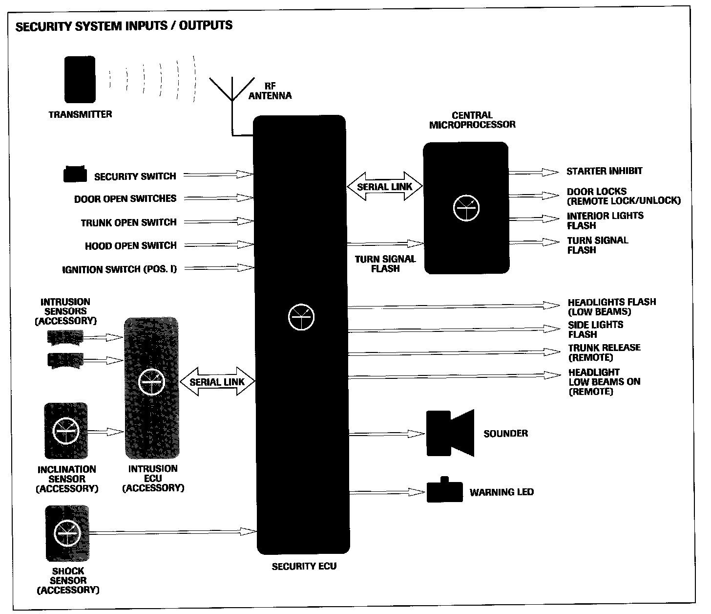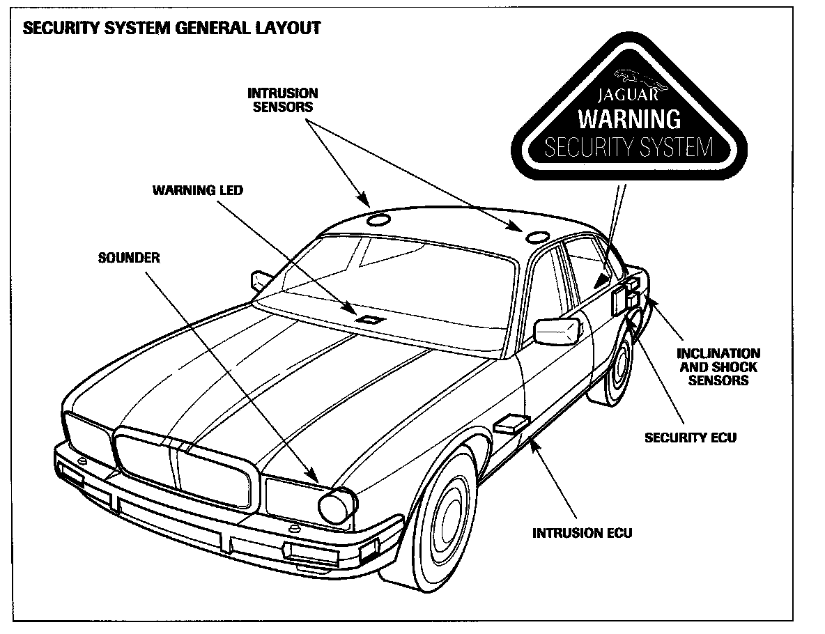 The system is built around the microprocessor based security ECU, which interfaces with vehicle inputs and outputs, controls vehicle functions via the central microprocessor (CPU), and interfaces with the remainder of the security system. All of the interfaces and functions are microprocessor controlled by the security ECU software. Located in the left forward corner of the trunk the ECU is the RF receiver for the system. The ECU connects to the serial communications data link for JDS diagnosis and programming.