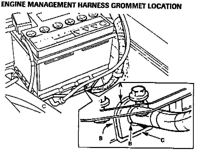 If 4.0L Sedan Range vehicles up to 1993 MY (VIN 667829) illuminate the transmission MIL and default to "Limp Home" mode during rainy weather or after using a car wash, seal the EMS harness grommet as described below.