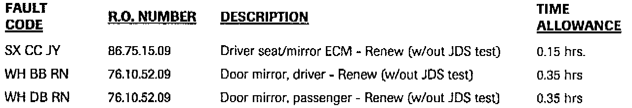 If the driver's seat and mirrors control module fails on a 1994 MY Sedan Range vehicle within the VIN range listed above, BOTH door mirrors must be replaced with revised mirror units (left mirror, part number HMD 3043AC) (right mirror, part number HMD 3042CC) when the ECM is replaced.