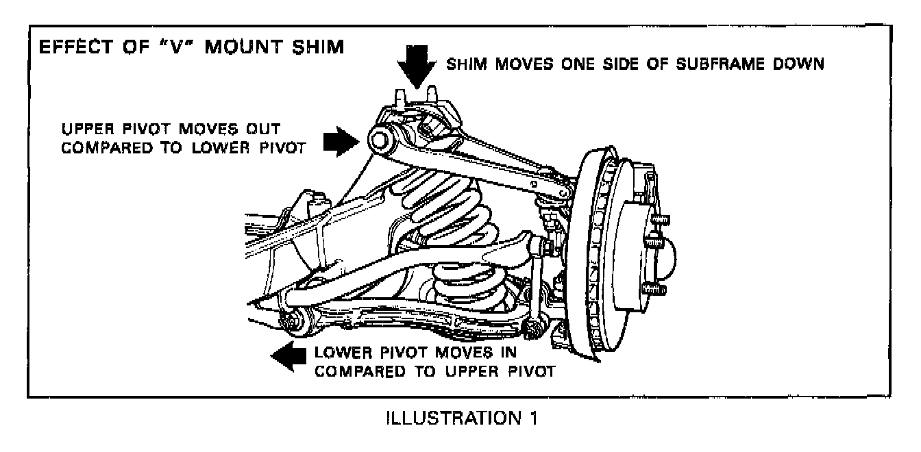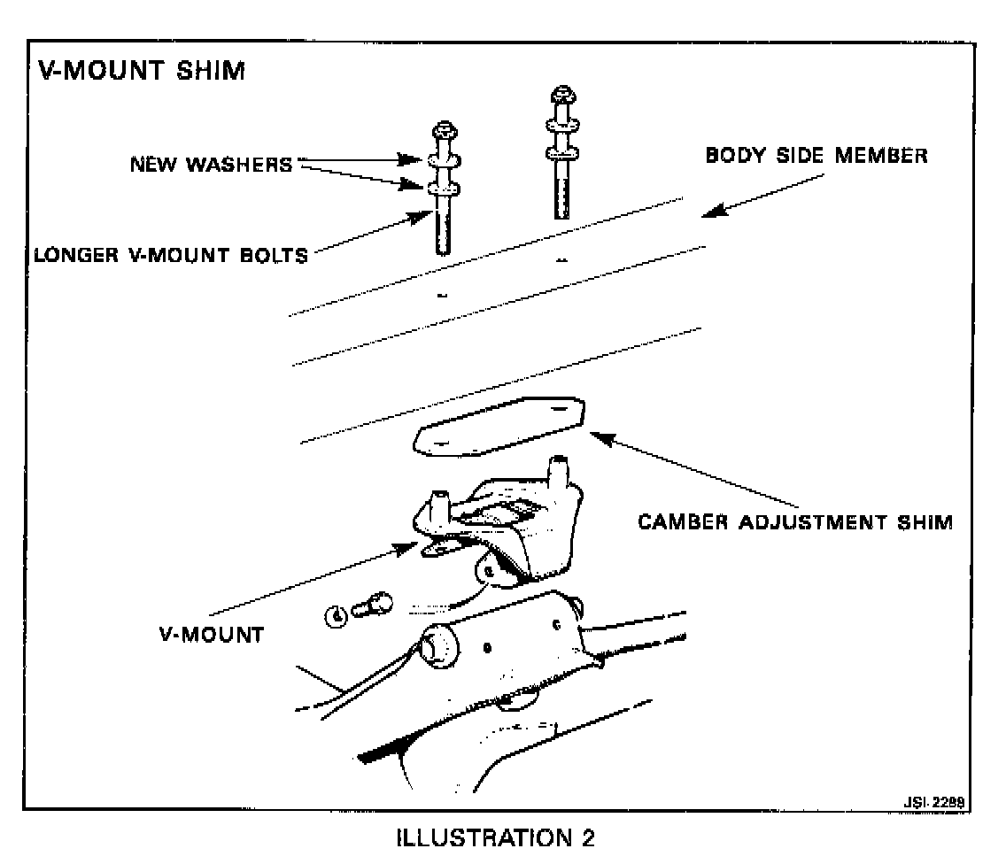 ^ Shimming one "V" mount causes the camber on that side to change toward a more positive (less negative) measurement (Illustration 1). At the same time, camber on the side opposite the shim moves toward more negative (less positive). This change has an equalizing effect that reduces the camber imbalance.
