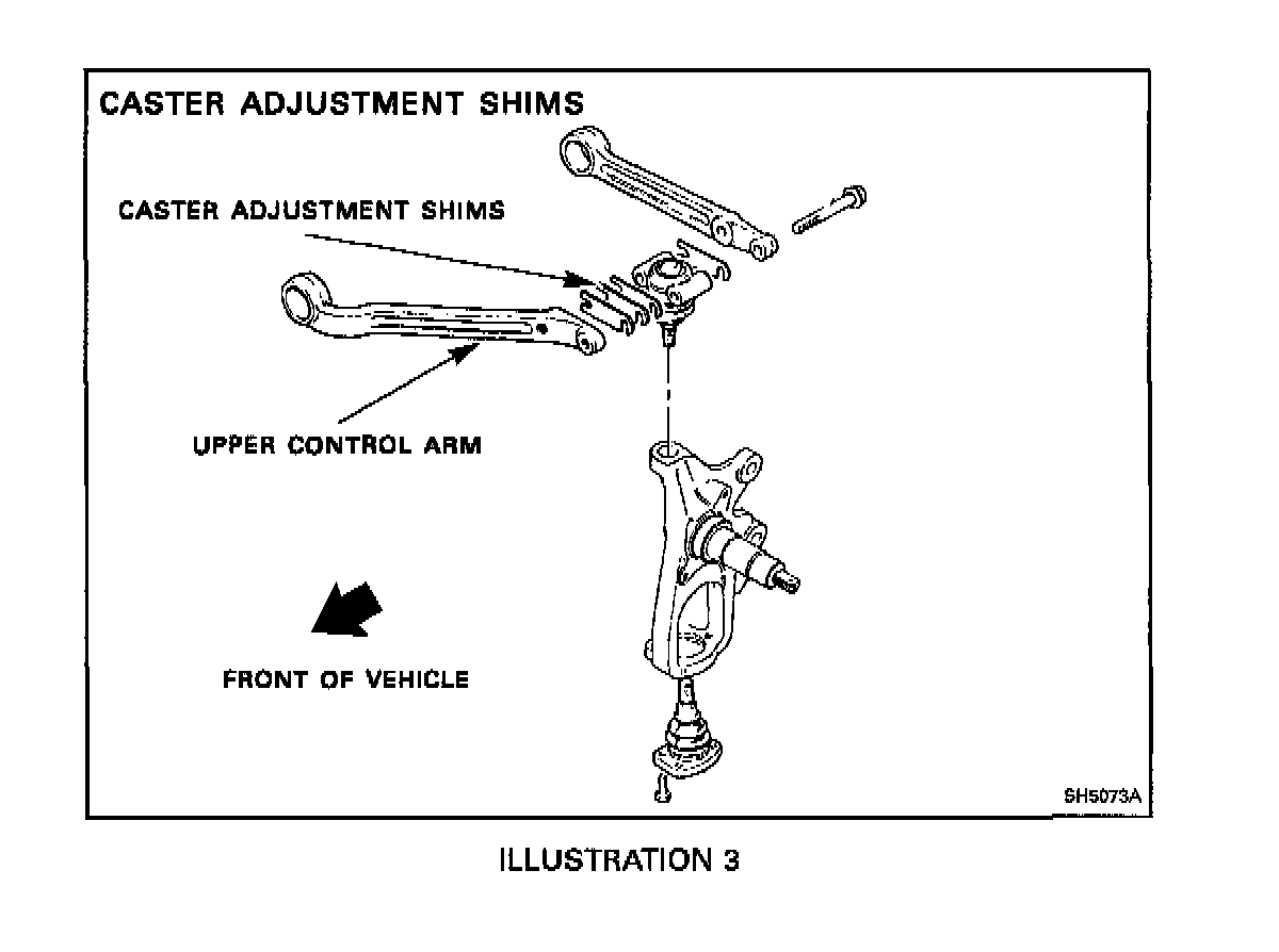 ^ Caster is adjusted by transferring shims from one side of the upper ball joint to the other (illustration 3). Do not change the total amount of shims by adding or subtracting shims.