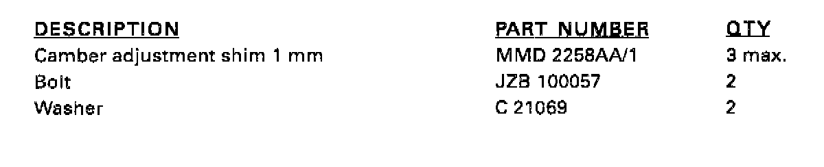 When shims are installed, the existing bolts, must be replaced by longer bolts, part no. JZB 100057, along with 2 washers, part no. C 21069 between the head of each bolt and the upper surface of the side member.