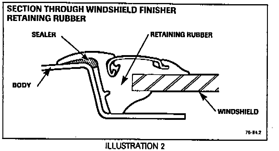 3. Apply a bead of 3M Windo Weld Primeness Superfast Urethane sealer (3M number 08609) under the outer edge of the retaining rubber (Illustration 2).