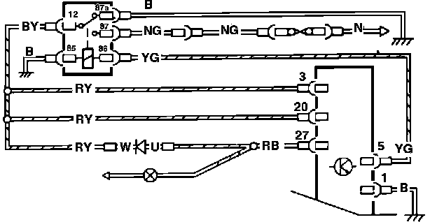 During the test routines, the ABS warning lamp is illuminated. The time the lamp is illuminated depends on the charging of the hydraulic accumulator. During this testing phase the electronic control module switches the warning lamp from pin 27 to pin 1 of the control module to ground. If the system test routines prove satisfactory the electronic control module opens the ground circuit between pins 1 and 27 of the control module, the circuit to ground is broken, the warning light is then extinguished. The warning lamp is supplied with battery voltage from the ignition switch when the ignition is switched on.