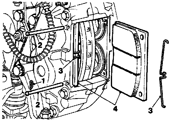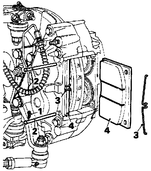 2. Remove the spring clips (1) securing the brake pad retaining pins (2); withdraw the retaining pins. Recover the anti-rattle springs (3) and withdraw the brake pads (4).