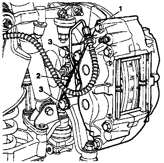 3. Loosen the caliper feed pipe union (1) at the support bracket and disconnect the feed pipe from the caliper. Plug the pipe to prevent the loss of fluid and ingress of dirt.