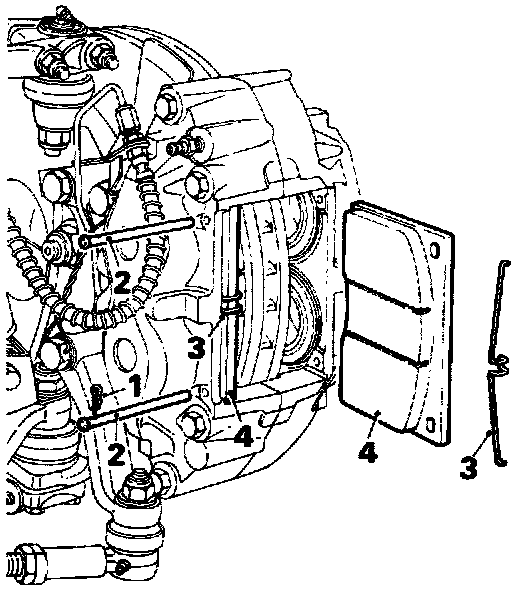 3. Remove the anti-rattle springs (3) and withdraw the brake pads (4).