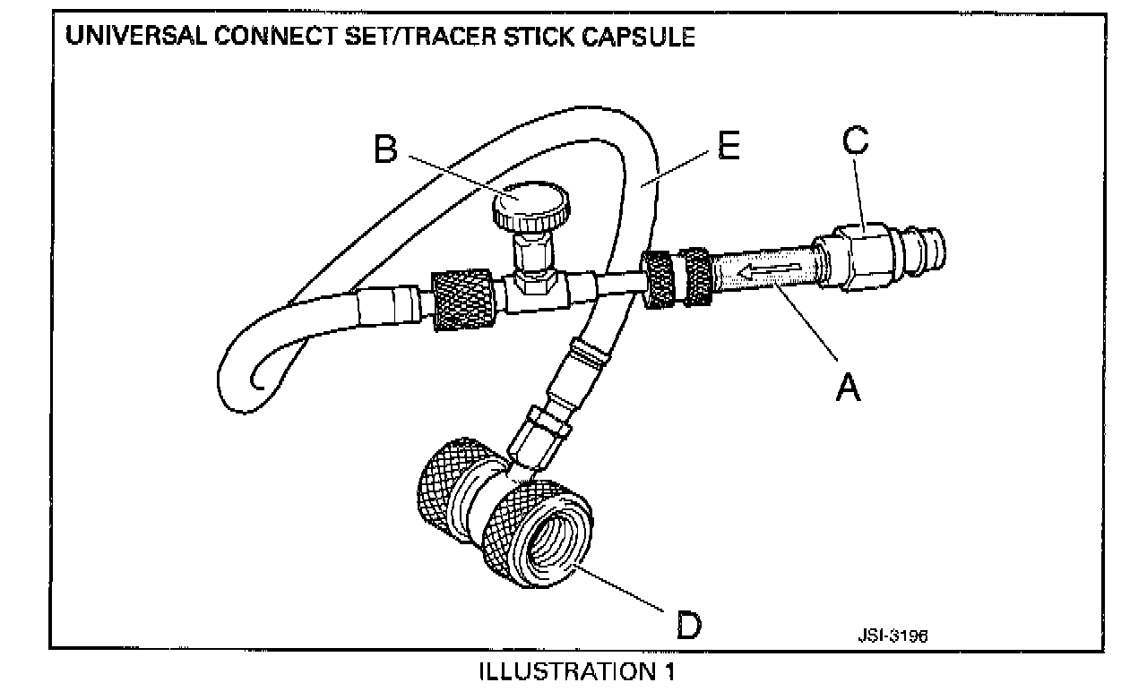^ The Universal Connect Set and Tracer Stick Capsule are used to introduce dye into the Air Conditioning systems of vehicles which were produced with systems charged with R134a, without the need to discharge the refrigerant.