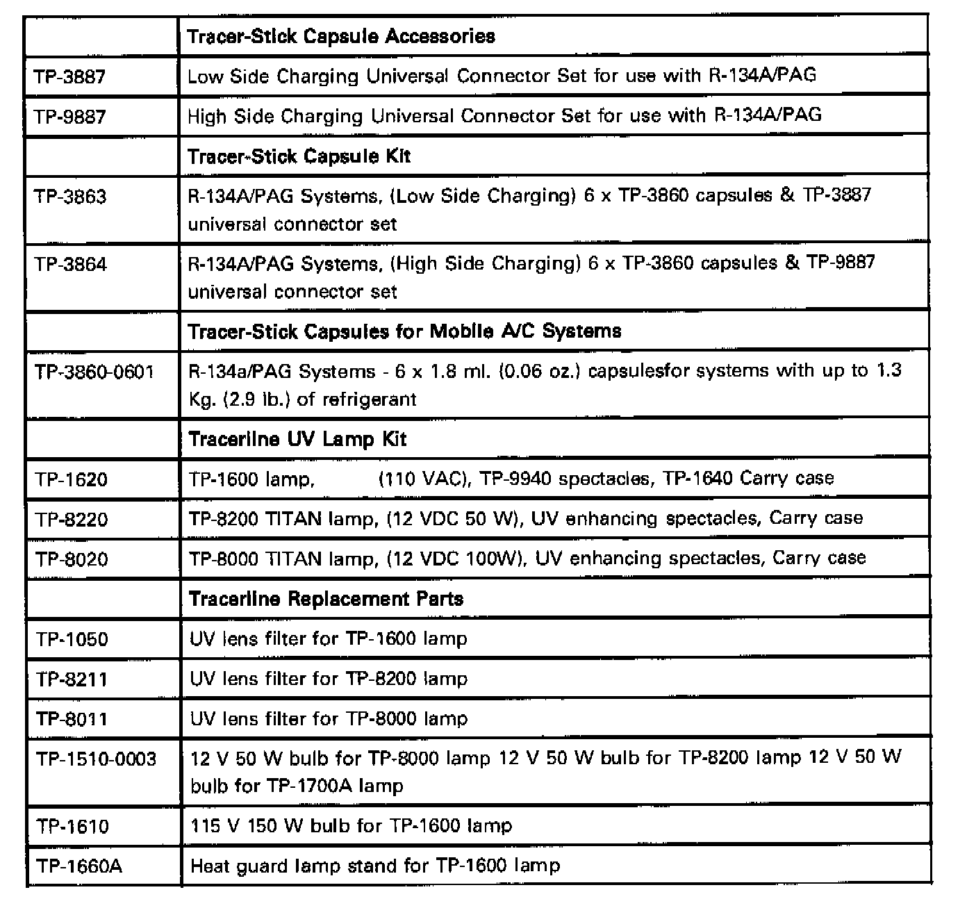 ^ The dye can be added to the air conditioning systems of all vehicles with R-134a systems using the Tracer Products Universal Connector set.