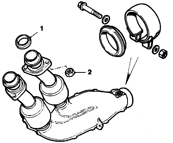4. Remove nut and bolt from joint clamp (1) between downpipe assembly and under floor catalyst assembly. Move clamp ring forward.