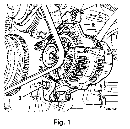 - Remove the generator link arm trunnion securing bolt (2 Fig. 1).
