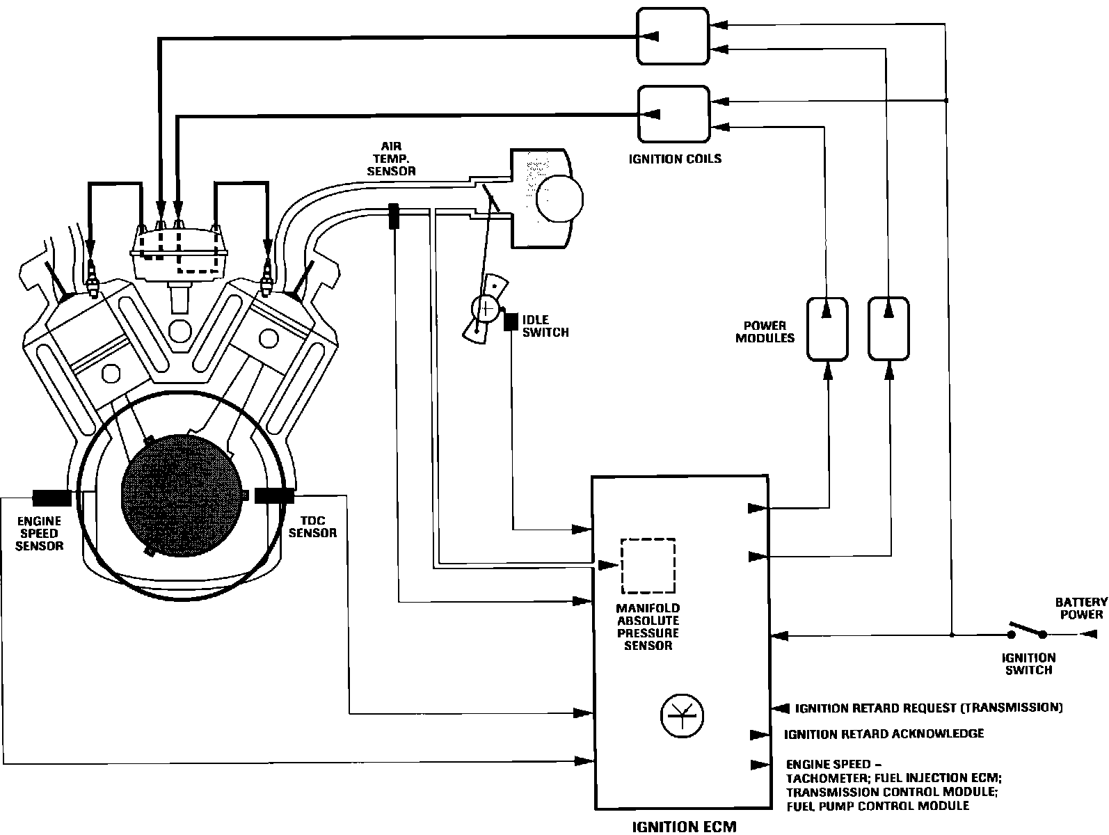 The ECM contains a microprocessor that is programmed with an ignition timing strategy providing precision choices for every engine speed and mode of operation. The ECM also receives input signals from: