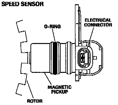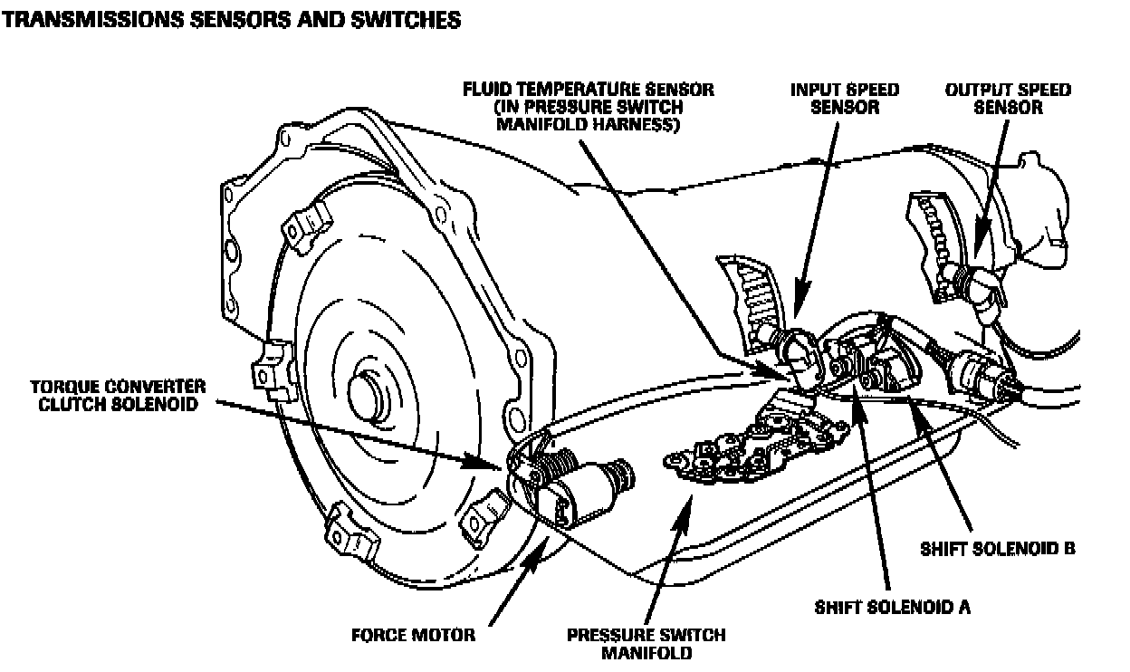 Transmission input speed sensor: The input speed sensor is identical to the output speed sensor except that it uses the machined teeth on the forward clutch housing as the rotor. The sensor produces an AC voltage input to the TCM proportional to torque converter turbine speed.