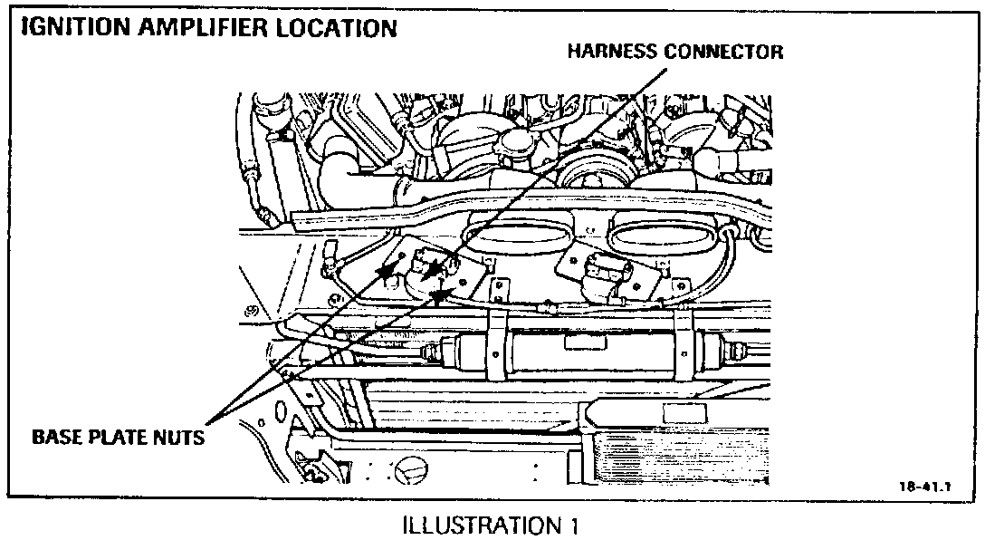 1. Disconnect the "A" bank (right) ignition amplifier harness connector and remove the two amplifier base plate nuts illustration 1).