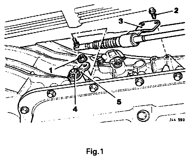 - Remove the retaining nut (1 Fig. 1) and release the selector cable from the transmission gear selector lever (5 Fig. 1).