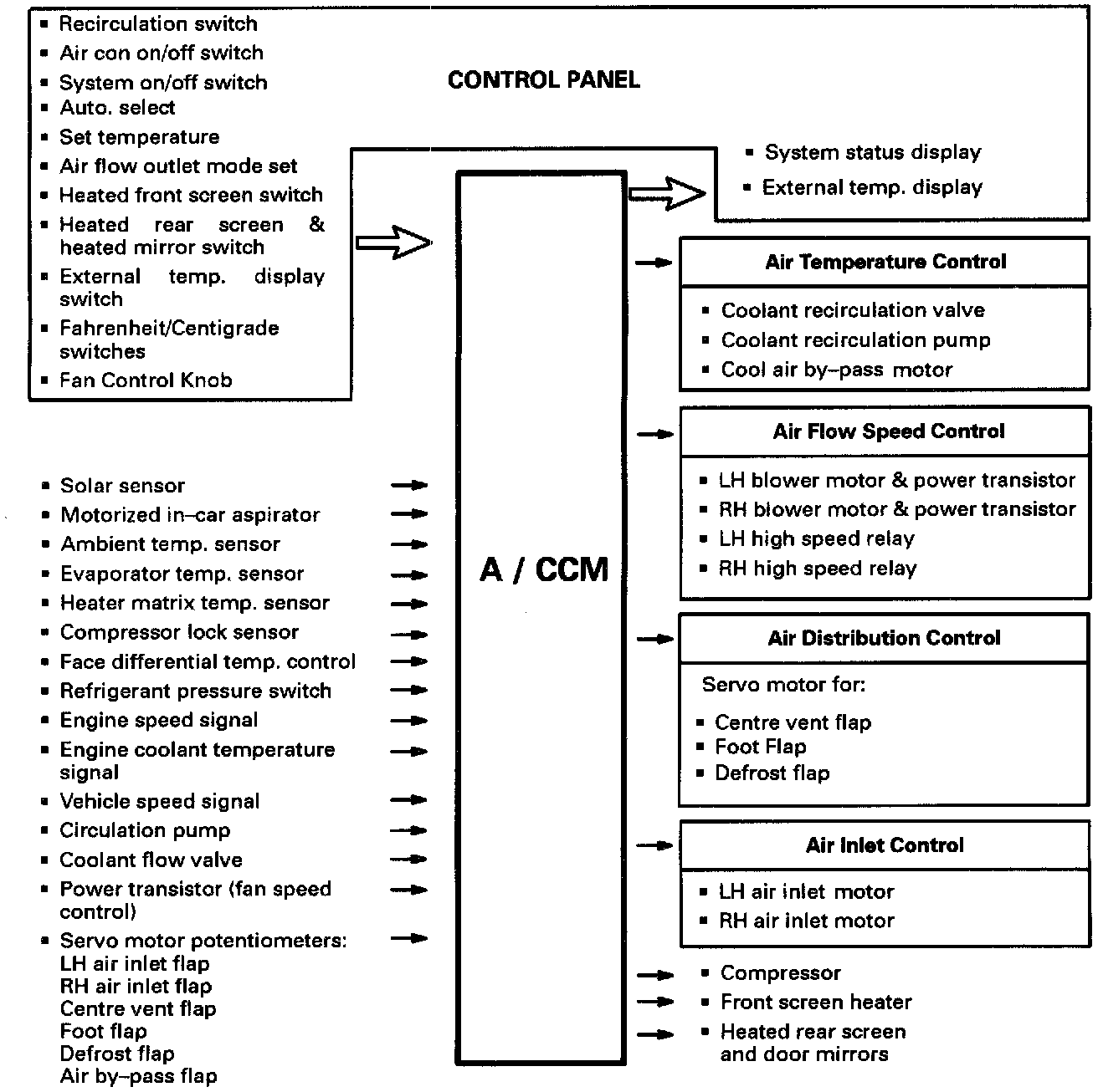 The climate control system peripherals communicate with the A/CCM via three main device categories, plus the vehicle power supply and ground connections.