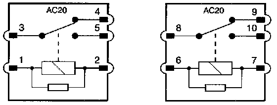 Relay connector numbers are shown within the relay. The connector number is shown in the upper portion of the relay; the pin (terminal) number is shown adjacent to the pin. Certain relays are paired and share a modular connector. In this instance, the connector number remains the same for both relays while the pin numbers of the second relay are identified by numbers 6-10.