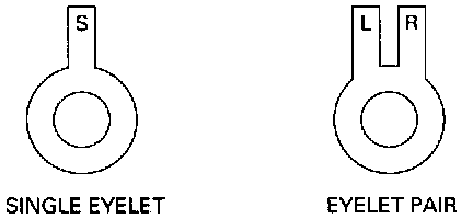 Two eyelet variations are used: a single eyelet and an eyelet pair. The single eyelet has a single 'leg', which is identified by an S; the eyelet pair has two 'legs', identified as L (left) or R (right).
