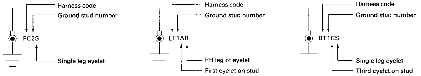 HARNESS CODE + GROUND STUD NUMBER + EYELET STUD POSITION (A,B,C) + EYELET DESIGNATION (S,L,R)