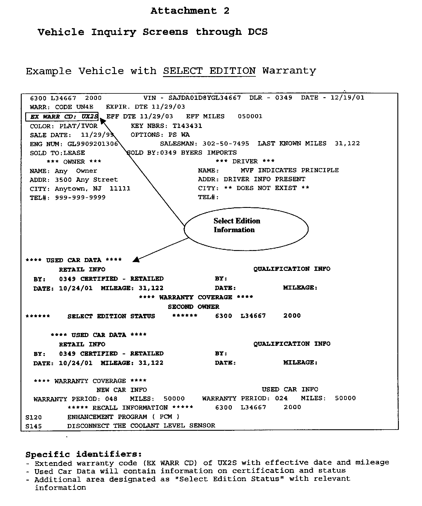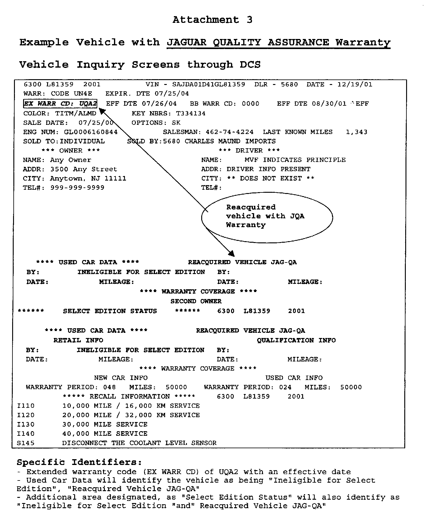 Dealer Service personnel can identify whether a car has a JQA Warranty by checking for EXWARR CD:UQA2 on the third line of the screen as shown in attachment 3.