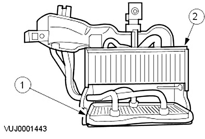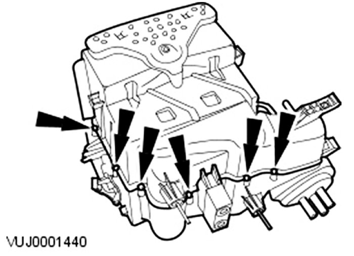 1. Remove the heater core and evaporator core housing, refer to Vehicle/ Heating and Air Conditioning/ Housing Assembly HVAC/ Service and Repair/ Removal and Replacement