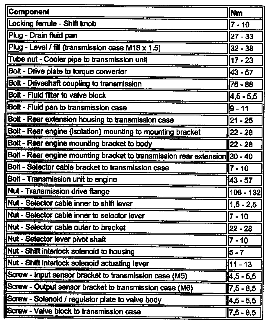 Torques - ZF Automatic Transmission (Normally Aspirated Vehicles):