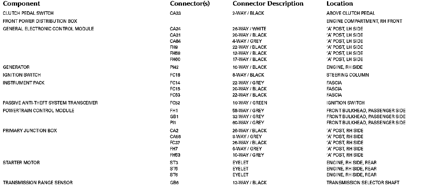 For detailed informations and illustrations regarding the location and identification of control modules pins, refer to Vehicle / Diagrams / Connector Views. Connector Views