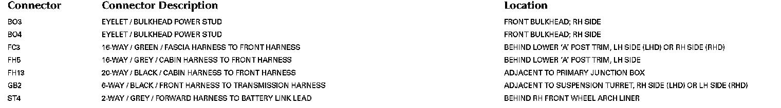Refer to Vehicle / Locations for detailed information and illustrations regarding the location and identification of harnesses, relays, grounds and control modules. Locations
