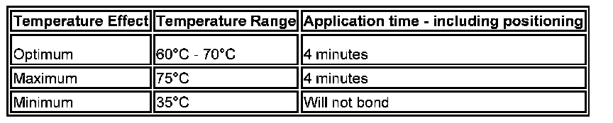 Raising the temperature of the adhesive will reduce viscosity and speed up the flow. It is recommended that the adhesive is pre-warmed in a heated cabinet for a minimum of twenty minutes and applied with an extrusion gun incorporating integral heating elements.