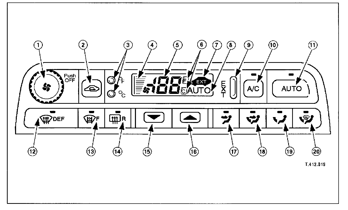 Pressing this button (BLUE symbol) decreases the interior temperature setting in 1° increments. Should the button be pressed when the setting temperature is below the lower automatic control temperature limit, the display will indicate 'LO'.