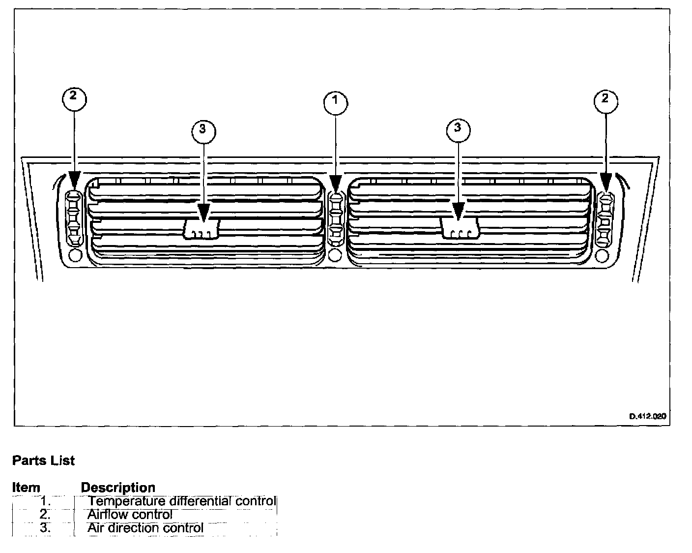 Only the center face air vent assembly incorporates the three listed controls; the EOD vents, not shown, only feature items 2 and 3.