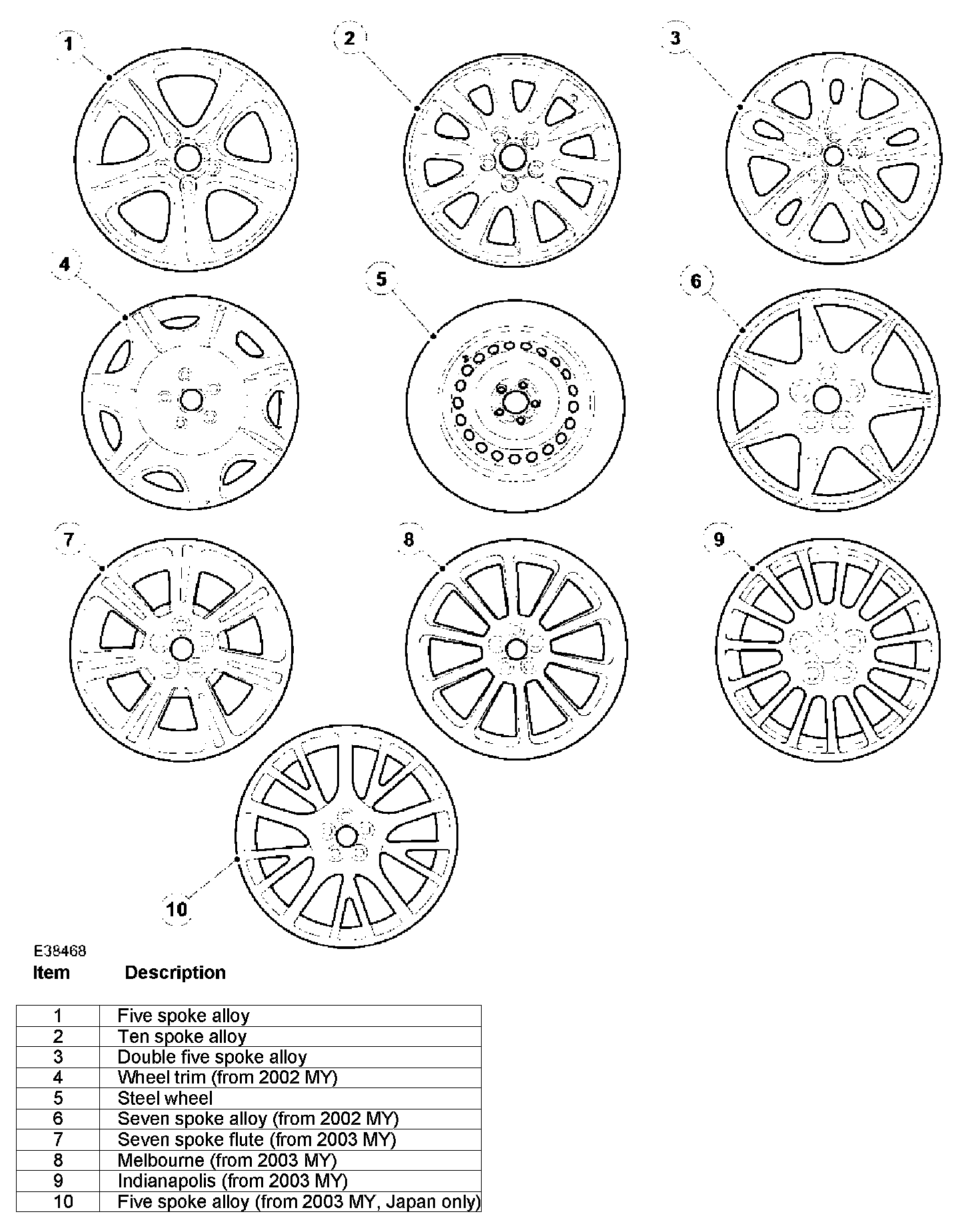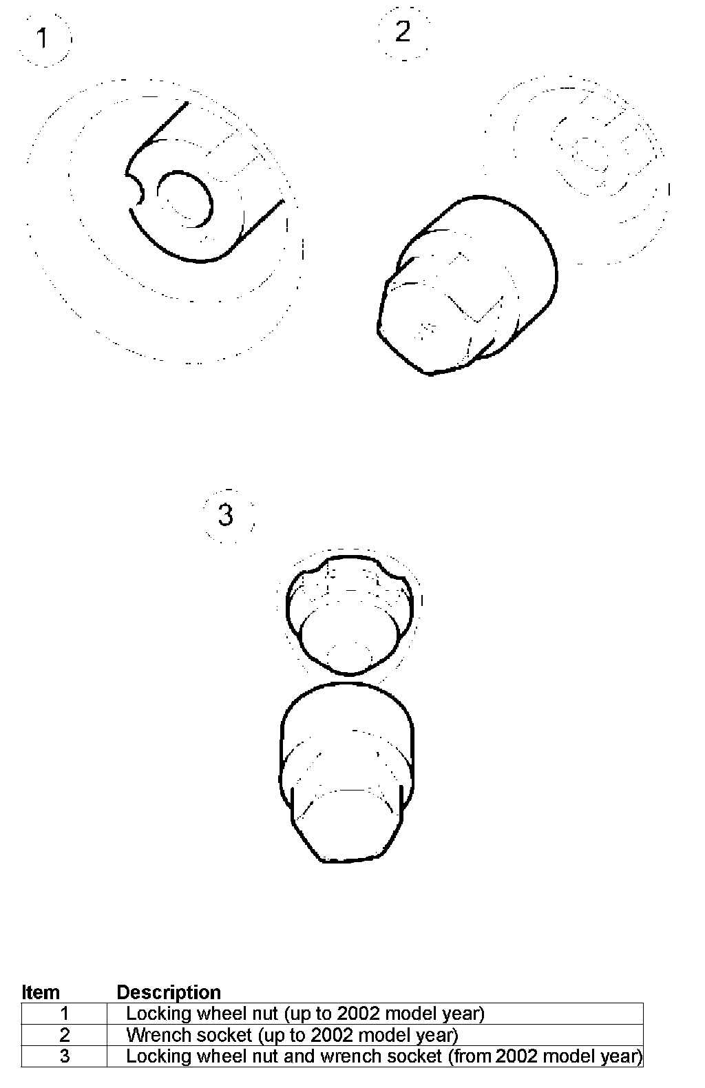 One locking wheel nut is fitted to each road wheel and may only be removed by using the correctly coded socket. For road wheels with exposed wheel nuts, each locking wheel nut is provided with a cover, which is removed using the special cover removal tool (up to 2002 model year only).