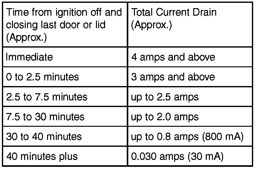 This bulletin provides specifications for quiescent current drains from the vehicle battery, as well as a procedure for measuring them using a digital volt/ohmmeter (DVOM).