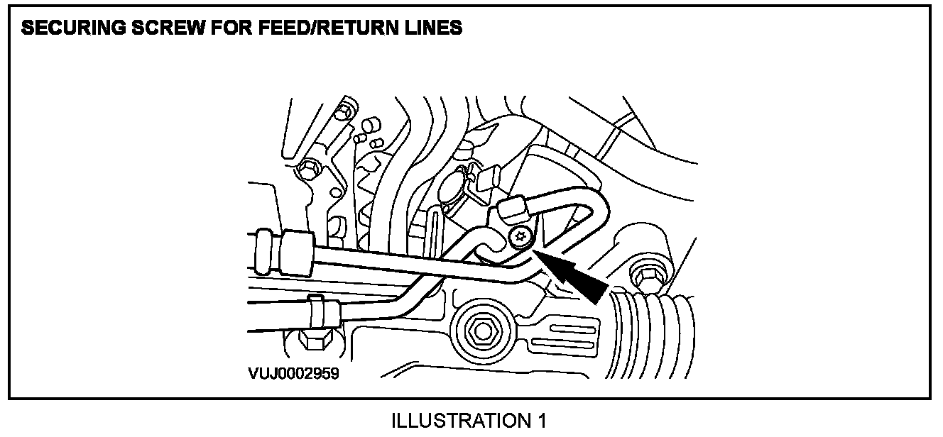 10. On all vehicles, remove the PAS rack feed and return pipes securing screw (Illustration 1).