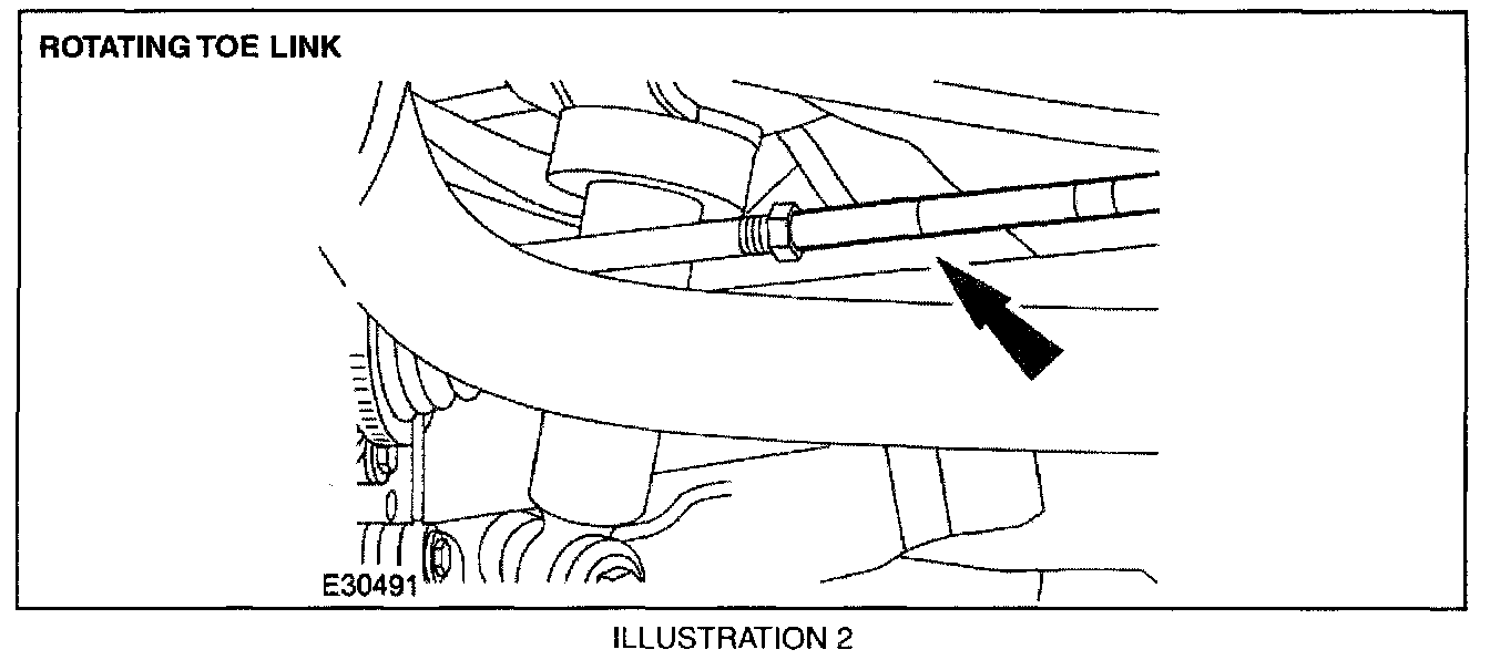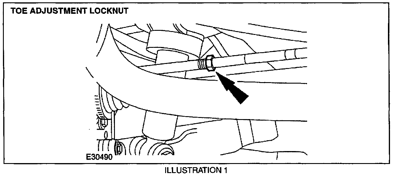 2. Left-hand, shown right-hand similar. Loosen the lock nut (Illustration 1). Clean and lubricate the lock nut and toe link threads.