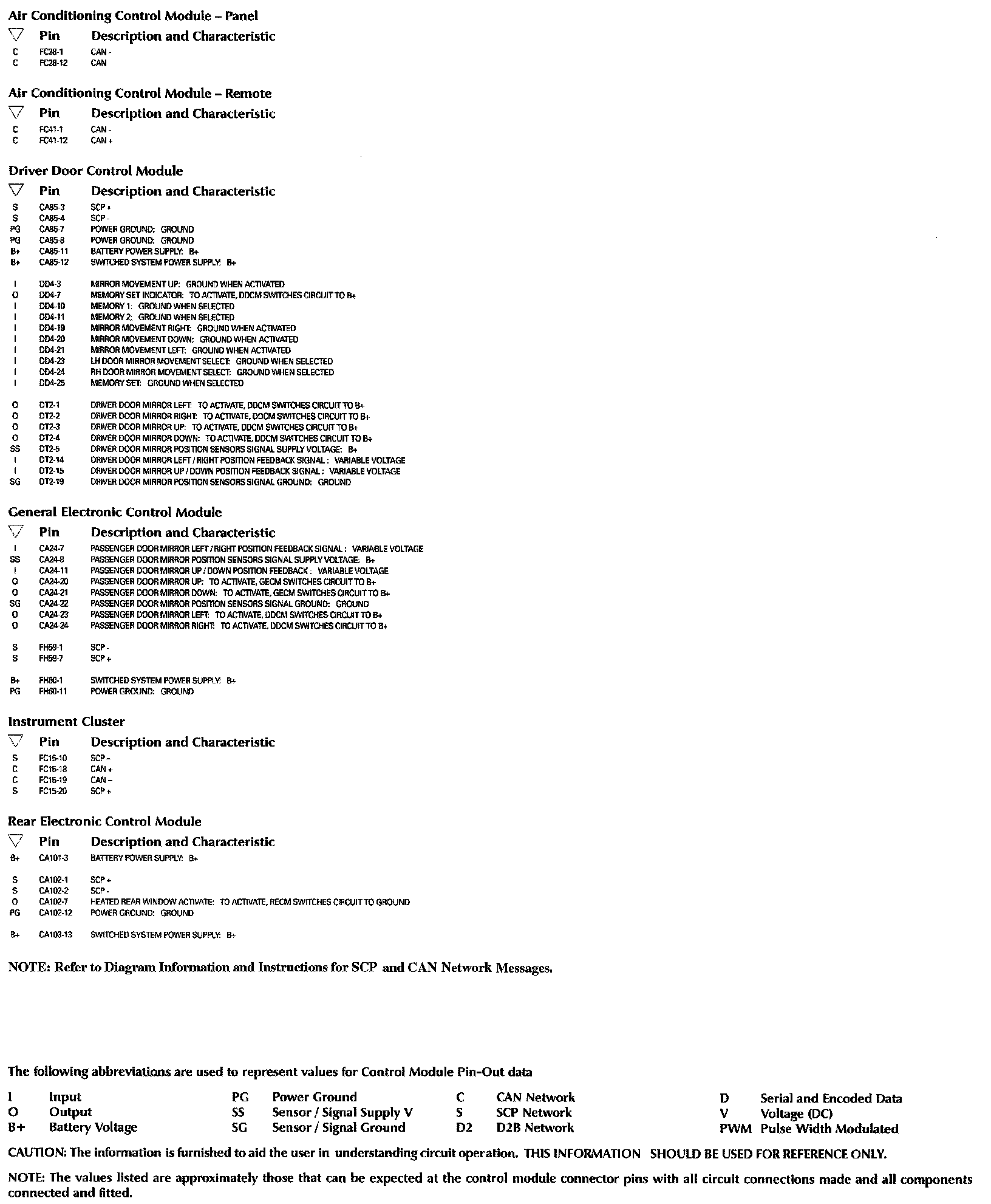 Control Module Pin-Out Information: