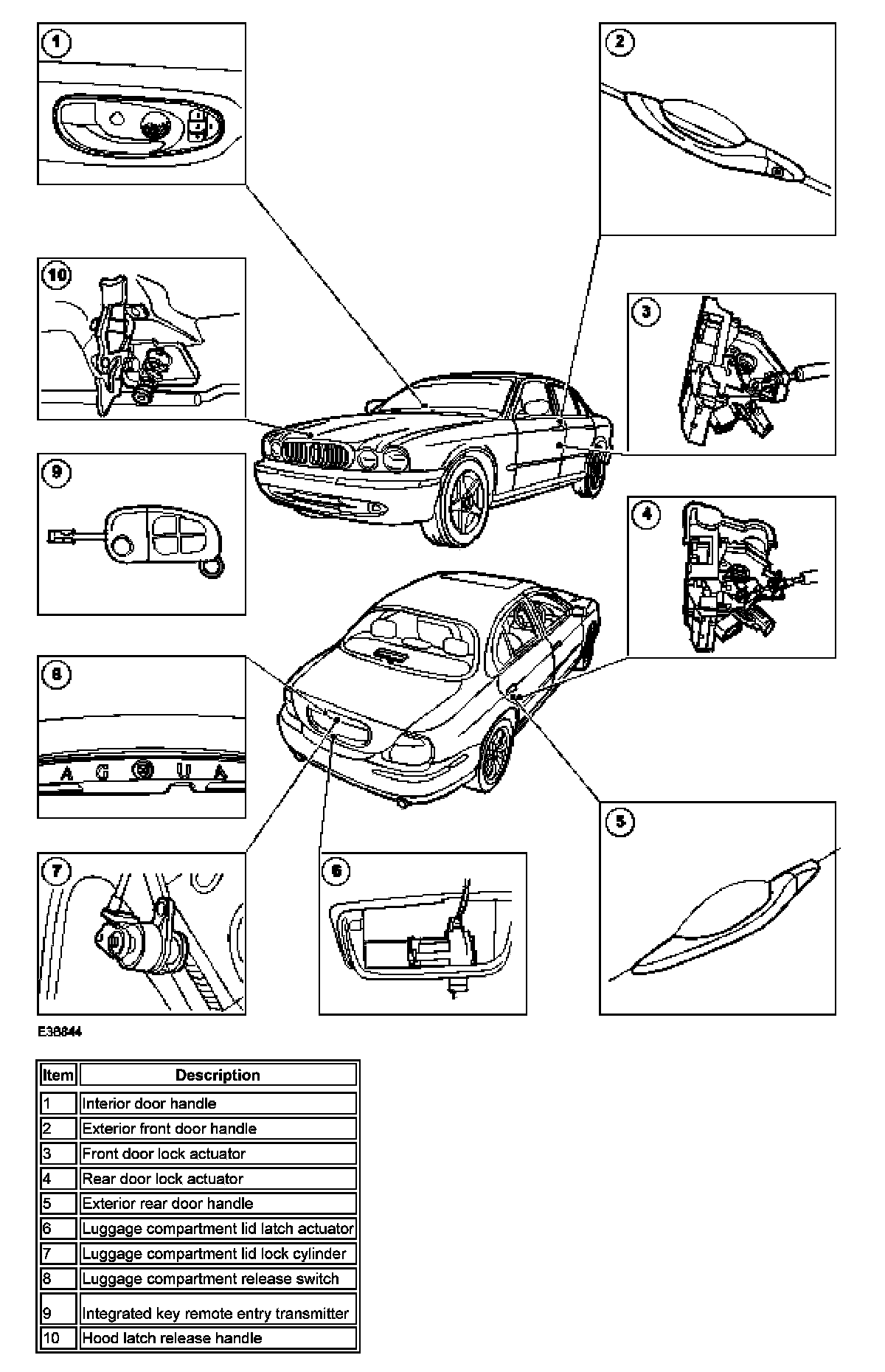When the vehicle is not locked, each door catch can be externally released by the corresponding exterior door handle which is operated by a single rod. When unlocked, or central locked, the door latches can also be released by the interior handles, each of which are operated by a single cable. Operation of the front door interior handles will also unlock the rear doors. Use of the key in the driver door lock cylinder operates the lock by a short rod to provide locking of the door latch. This in turn locks all other doors and the luggage compartment through the central locking system. These locking functions can also be achieved by use of the remote transmitter.