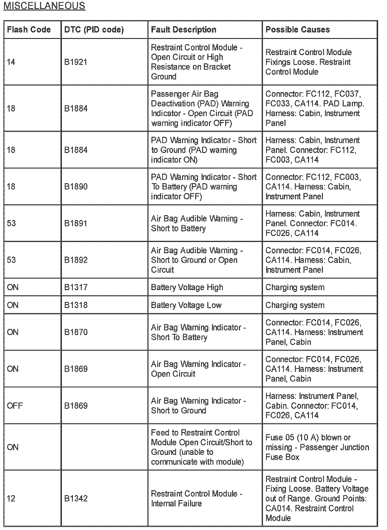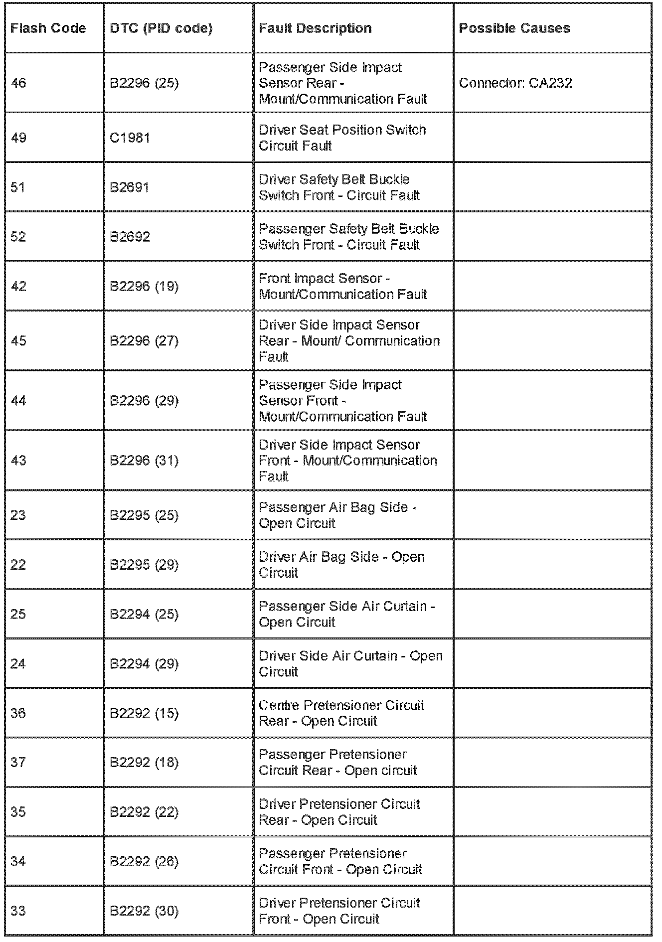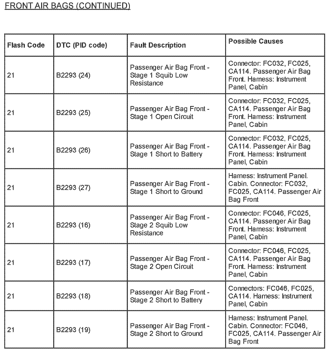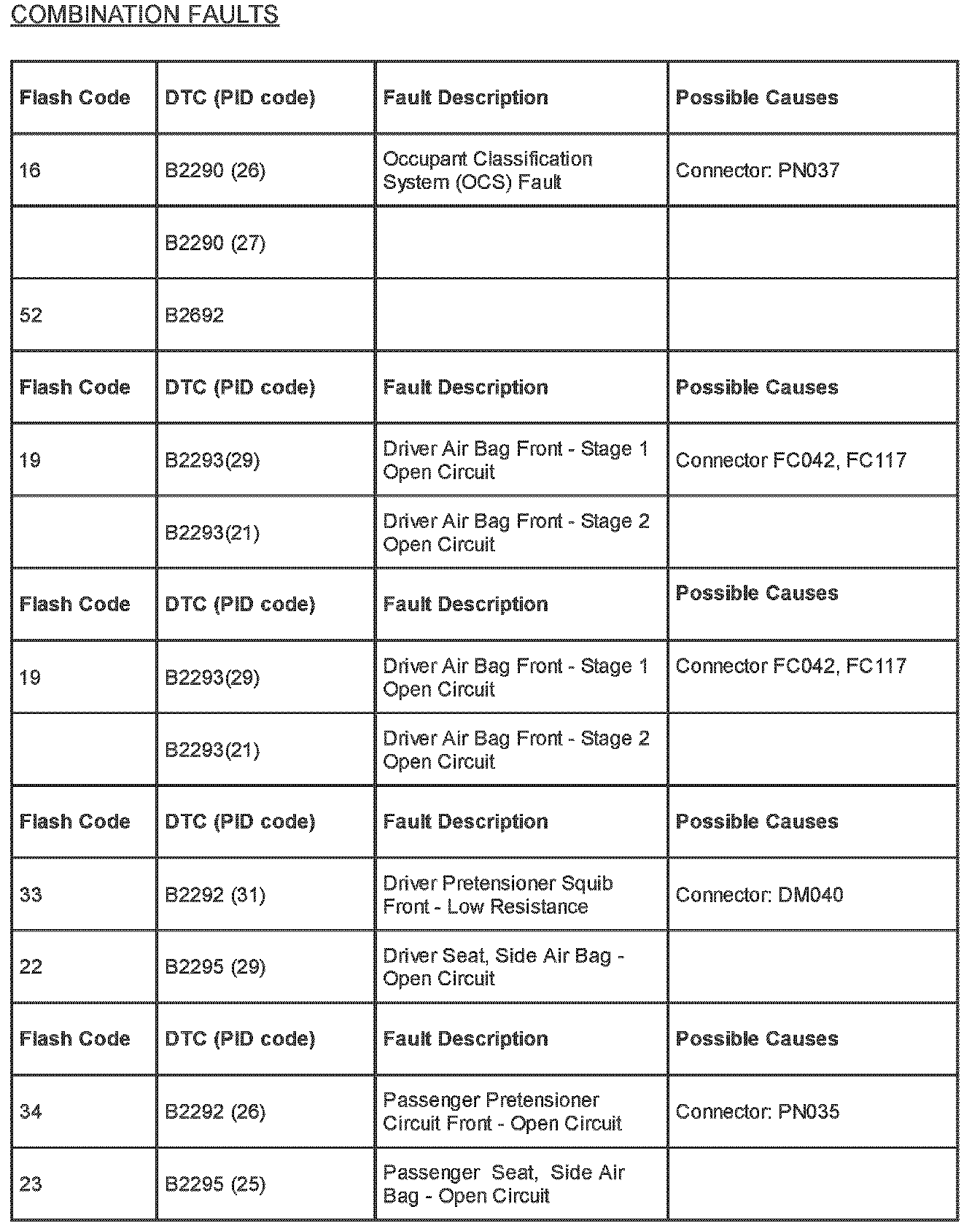 Supplemental Restraint System (SRS) Flash Code and PID Code Definitions - Diagnostic Aid