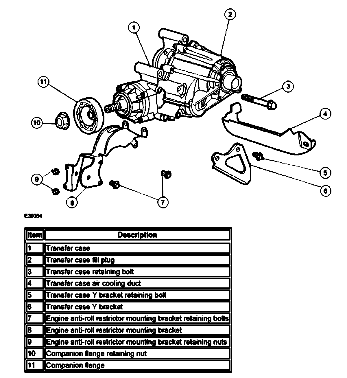 Transfer CaseThe transfer case system consists of a power transfer unit, rear driveshaft, coupling device and rear axle. The power transfer unit is a gearbox that attaches to the transaxle. The right hand halfshaft engages to the transfer case link shaft which engages to the differential side gears as in a normal 4x2 application. The transfer case provides power to the driveshaft through a helical gear spline coupled to the transaxle differential case, a helical gear drop (idler gear) and hypoid/helical ring gear assembly and pinion set. Repair of the transfer case is limited to seals and gaskets. If any of the geared components, tappered roller bearings, case cover or internal shafts fail, a new transfer case must be installed. The transfer case is sealed from the transaxle and has its own sump. The transfer case uses SAE 75W140 synthetic gear lubricant. The fill plug is located on the top of the transfer case, under the engine anti roll restrictor mounting bracket.