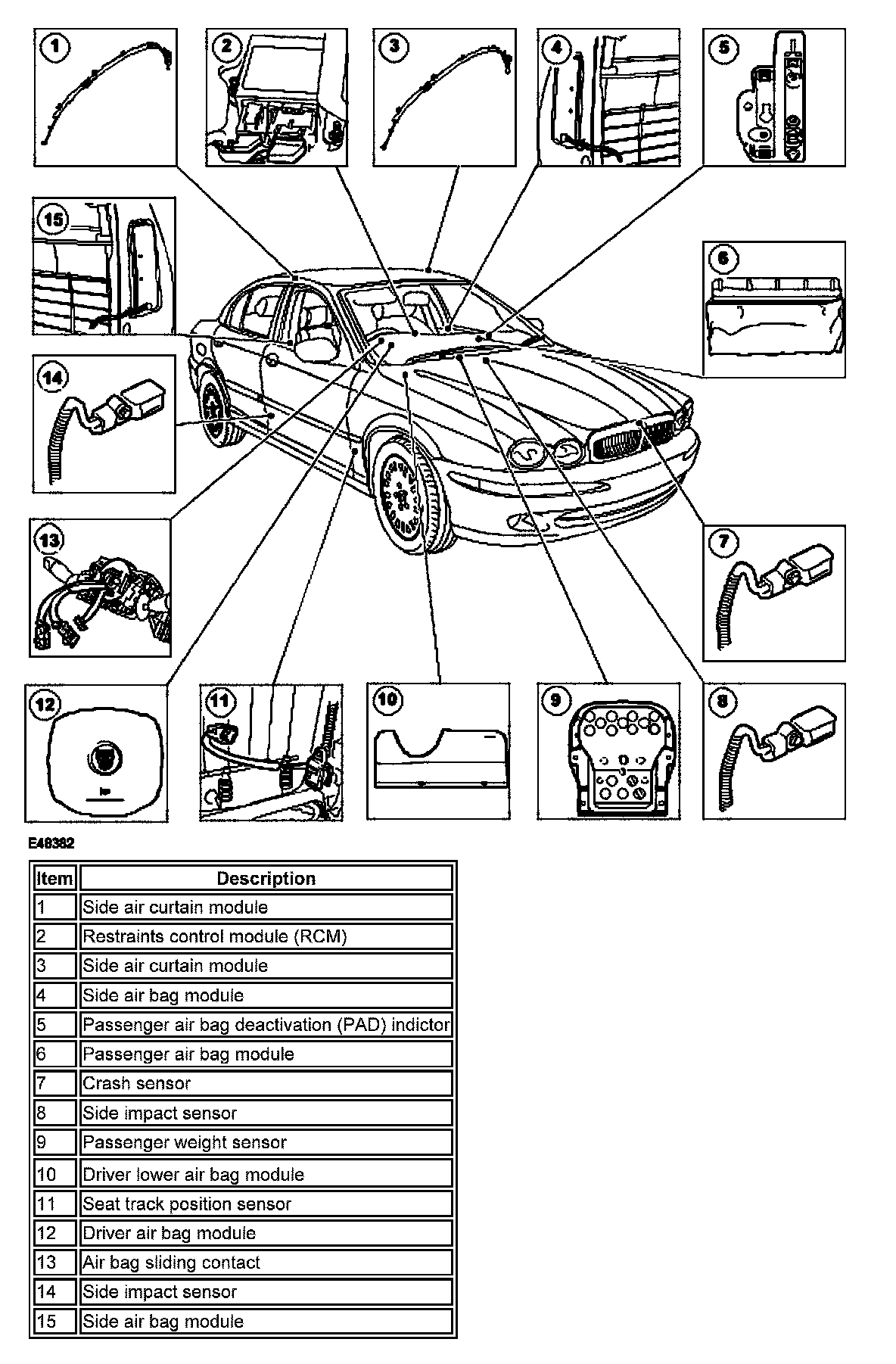 Information on the severity of an impact is received from the crash sensor. In the event of a side impact, in excess of a predetermined limit, the air bag control module will evaluate the signal received from either of the side impact sensors against stored data and deploy the corresponding side air bag module and the side air curtain module. In the event of a frontal impact, in excess of a predetermined limit, the air bag control module will evaluate the signal received from the front crash sensor against stored data and deploy the front air bag modules and the safety belt buckle pretensioners. Variations in the deployment of the front air bag modules are dependent on the status of the driver seat track position, passenger weight sensor and the front safety belt buckles.