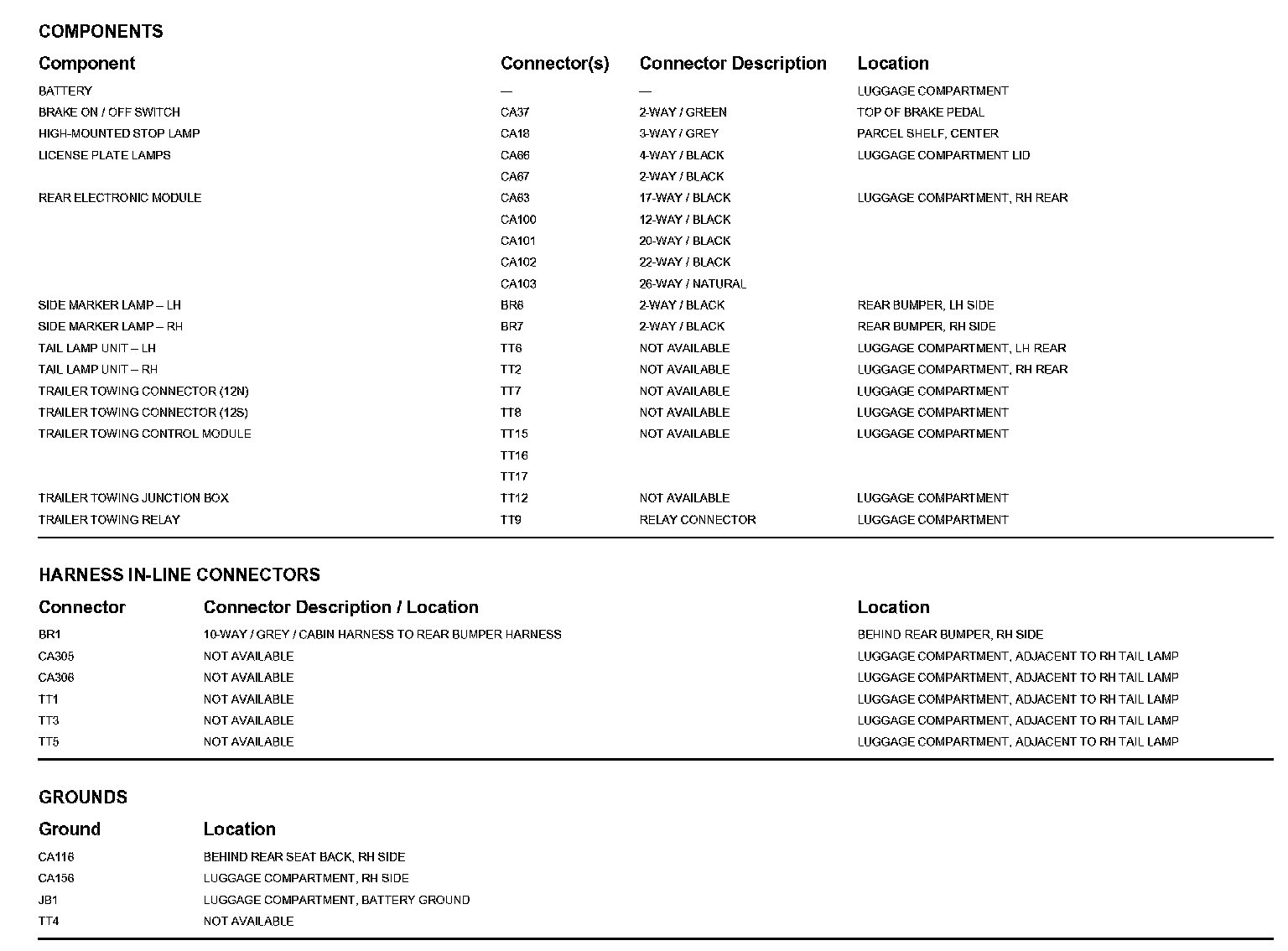 Locations: The location views for Ground Points, In-Line Harness Connectors, Harnesses, and Control Modules depicted within these diagrams can be found at Vehicle/Locations. Locations