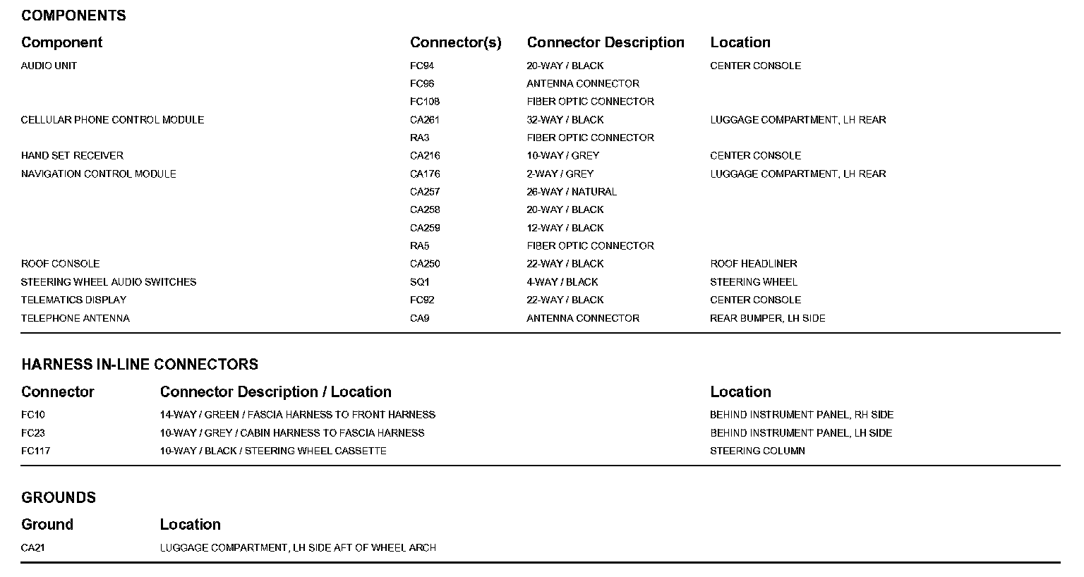 Locations: The location views for Ground Points, In-Line Harness Connectors, Harnesses, and Control Modules depicted within these diagrams can be found at Vehicle/Locations. Locations